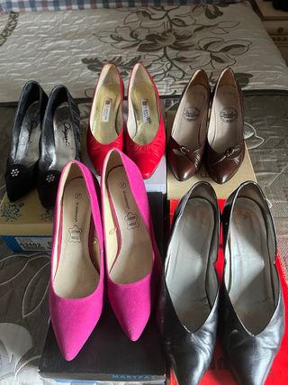 Lote variado de 11 zapatos, muchos de ellos sin estrenar. Incluye varios pares en diferentes estilos. La talla de la mayoría es 35, alguno es talla 36. - Zapatos de tacón negros. - Bailarinas negras. - Sandalias doradas. - Botines negros. - Zapatos de salón grises y azules. - Zapatos de tacón beige y rojos. - Sandalias verdes. Se vende todo el lote por 30€ El par suelto por 3€