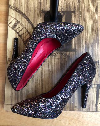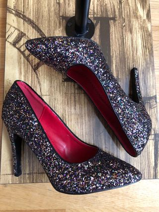 Elegantes tacones con acabado de purpurina que añaden un toque festivo a cualquier conjunto. talla grande plantilla mide 25,5 apto para 39 - Diseño de punta fina. - Interior en color rojo vibrante. - Tacón de aguja.