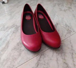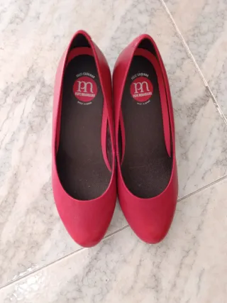 Zapatos, tipo manoletinas, pero con un poco de tacón, de color rojo. Solo se ha usado un par de veces. Número 37.
