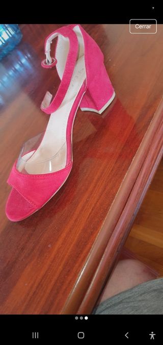 Zapatos beig con 2 tiras transparentes. Y una suela muy comoda. Talla 40/41 yo gasto 40 y me estaban perfectos. 1 solo uso.