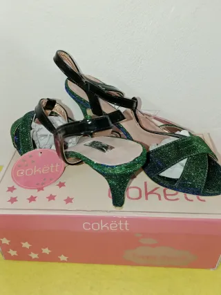 Elegantes zapatos de tacón de la marca Cokett, de fabricación española. - Diseño con tiras cruzadas en el empeine. - Acabado brillante con purpurina. - Cierre de pulsera al tobillo. - Tacón fino.