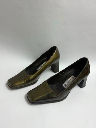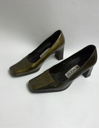 Elegantes tacones vintage de la marca LUXAX en un llamativo color verde oliva. Perfectos para añadir un toque de estilo a cualquier atuendo. - Diseño de punta cuadrada. - Tacón grueso y estable. - Acabado brillante.