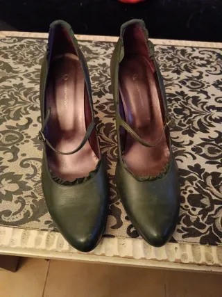 Preciosos zapatos de tacón con un diseño retro en color verde oliva. Han sido usados en muy pocas ocasiones y los vendo por falta de uso, a pesar de que me parecen muy especiales y bonitos. - Talla 37 - Material exterior de piel. - Color verde oliva - Detalle de pespuntes decorativos. - Suela de goma.