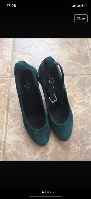 Zapatos de tacón con plataforma. Antelina verde turquesa/mar. Talla 37 pero calza pequeño, como un 36. Por eso los vendo, me están pequeños aunque me encantan. Tienen algún roce pero cepillándolos quedarían como nuevos.