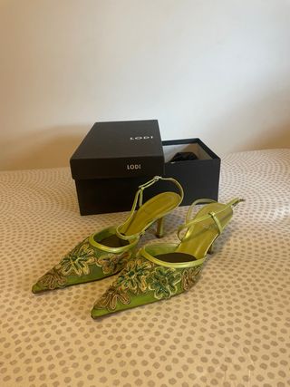 Zapatos de vestir en color verde con adorno joya de la diseñadora Silvia Navarro. Puestos únicamente en una ocasión. Comprados por 139 euros.