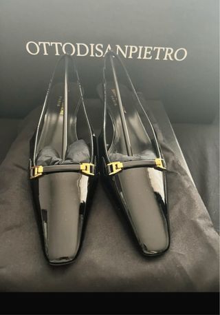 Zapatos destalonados marca YSL Yves Saint Laurent Modelo 709174 1TVKK 1000 Vernice grupy/oro antic Color nero Talla 36 + (1/2) Un único uso interior sobre moqueta recibos de compra Ottosampietro Precio NO negociable