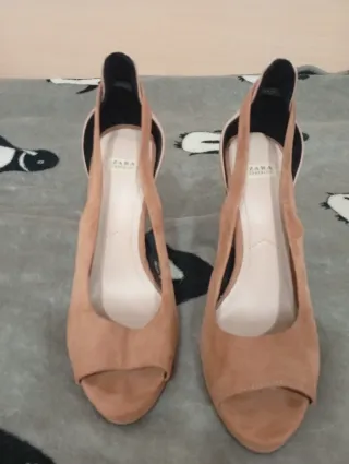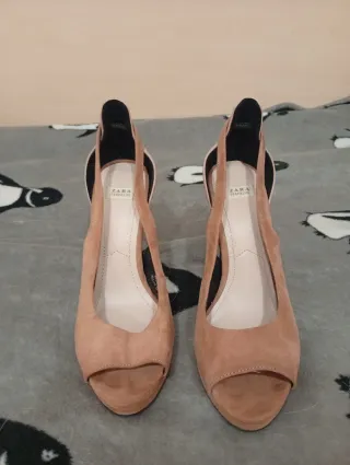 Elegantes tacones peep toe de Zara. - Diseño abierto en la punta. - Acabado en ante. - Incluye plantillas antideslizantes de silicona. Usados una vez.