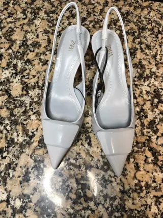 Elegantes zapatos de tacón bajo de Zara. - Diseño de punta afilada. - Correa de talón. - Acabado brillante.