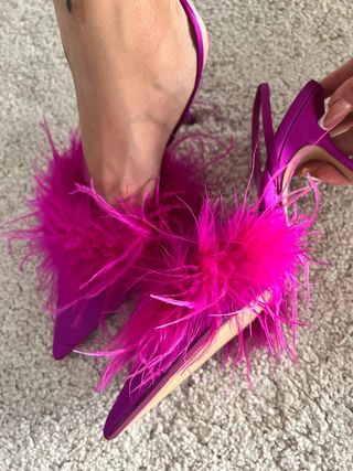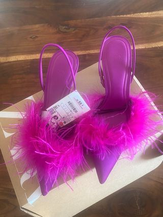 Zapatos tacón sandalias mules plumas fucsia Zara