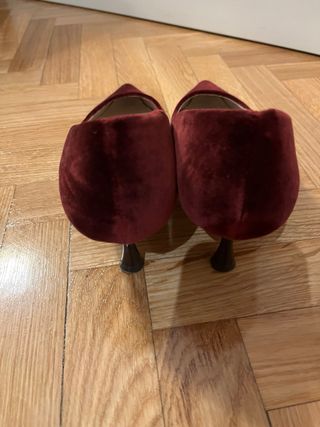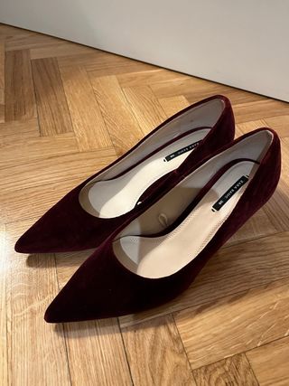 Elegantes zapatos de tacón de Zara. - Material: Piel. - Color: Granate. - Diseño con lazo decorativo en la punta. - Tacón cuadrado. Zapatos de tacón sesentero, detalle de lazo. Son de ante y por dentro de piel.