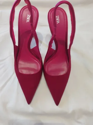 Elegantes sandalias de tacón con detalle de plumas. - Color fucsia vibrante. - Diseño de punta afilada. - Tira fina en el talón. Zapatos de tacón raso en color rosa fucsia con detalle de plumas y elástico en el talón. El tacón mide 8 cms. Muy elegantes. Precio de compra: 69,95€. Totalmente agotadas. Disponibles en talla 38 y 39. Nuevas a estrenar con etiqueta y caja. Precio no negociable. Hago envíos #taconesplumaszara #zapatosplumaszara #sandaliasplumaszara