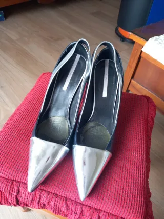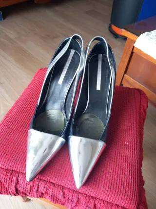 Elegantes zapatos de tacón con un diseño moderno y llamativo.11 cm de tacón - Punta afilada con detalle metálico plateado. - Combinación de negro y plata. - Poco uso.