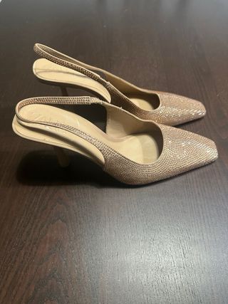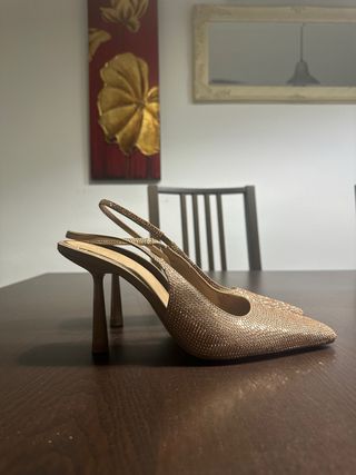 Elegantes zapatos de tacón de Zara. - Diseño de punta fina. - Acabado en malla. - Detalle brillante en el borde.