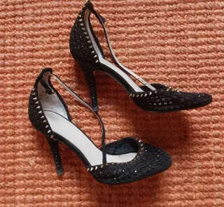Elegantes zapatos de tacón de Zara, perfectos para ocasiones especiales. - Diseño con tachuelas doradas. - Acabado en ante negro. - Tira al tobillo para un ajuste seguro.