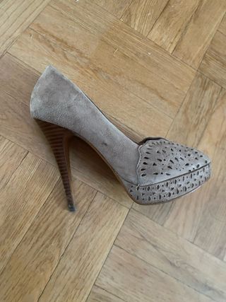 Preciosos zapatos de tacón de la marca Zara, en color beige. Son de ante y tienen un diseño con perforaciones. Ideales para cualquier ocasión especial. - Tacón alto. - Diseño con abertura en la puntera. - Perfectos para eventos elegantes.