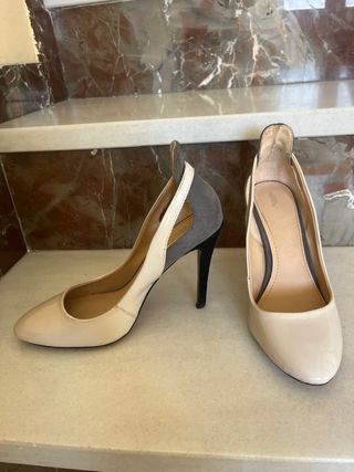 Elegantes tacones de la marca Zara, combinando charol y ante. - Diseño bicolor en beige y gris. - Tacón fino y alto. - Punta fina. *Tiene algunos desgastes en la cara interna del zapato, se ve en las fotografias