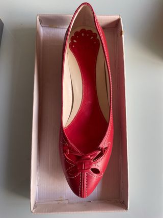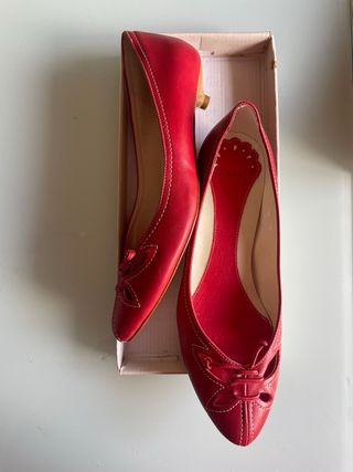 Elegantes zapatos de tacón de la marca Zara. - Color rojo vibrante. - Diseño con detalle de lazo y cortes. - Tacón de madera.