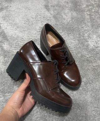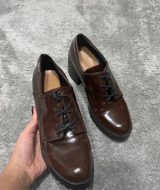 Zapatos de vestir de la marca Zara en color marrón. Cuentan con un diseño elegante y moderno. - Tacón grueso y plataforma. - Cierre con cordones. - Acabado brillante.