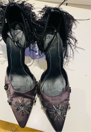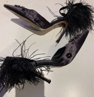 Elegantes zapatos de tacón de Zara con un diseño llamativo. - Acabado satinado en tono gris oscuro. - Adornados con pedrería y cuentas. - Detalle de plumas negras en el tobillo. - Cierre de pulsera.