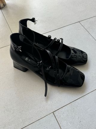 Zapatos de charol negros de Zara. - Diseño con tiras cruzadas. - Cierre de hebilla en el tobillo. - Punta cuadrada.