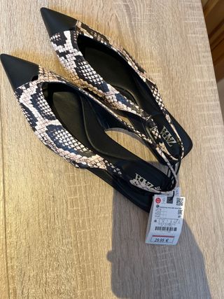 Elegantes zapatos de Zara con un diseño de piel de serpiente. - Punta fina. - Diseño destalonado con tira. - Detalle en punta. - Suela plana.