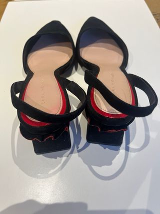 Elegantes zapatos destalonados de Zara en color negro. Perfectos para cualquier ocasión. - Diseño destalonado. - Material exterior de ante. - Tira fina en el tobillo. - Punta fina. Zapato destalonado en ante con detalle volante rojo en tacón. Altura del tacón 6,5cm. #zapatosmujer #zapatosdestalonados39 #zapatonegromujer39 #zapatosdetacón #zapatosdevestir