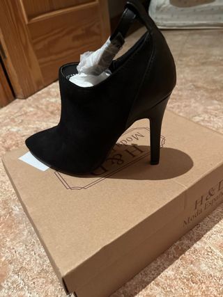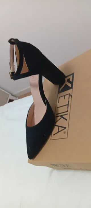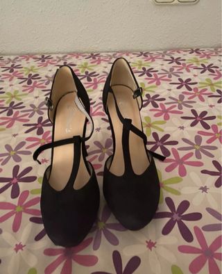 zapato de color negro con tacón cómodo, atado al tobillo. usado una vez