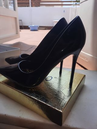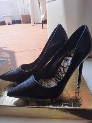Zapatos sin estrenar Talla 39. Son de brillo negros, con tacón alto y fino. Con suela e interior en leopardo con purpurina y tengo la caja y sus bolsitas. Nunca los he estrenado porque tengo en pie muy plano. Me costaron 20€. Los vendo por 9€ porque me da pena tenerlos en el armario.