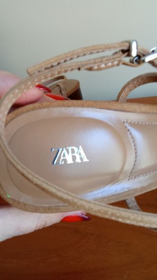 Preciosos zapatos de tacón de la marca Zara. Son de color beige y talla 39. - Diseño de peep toe. - Material charol brillante. - Tacón de cuña. - Se venden en su caja original.