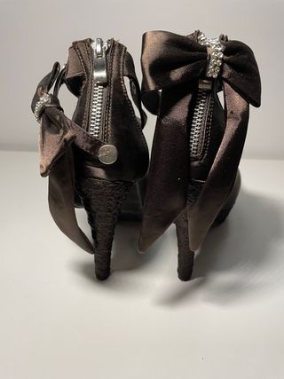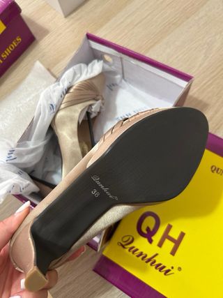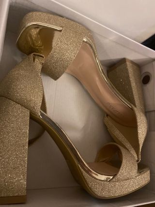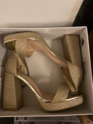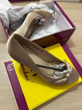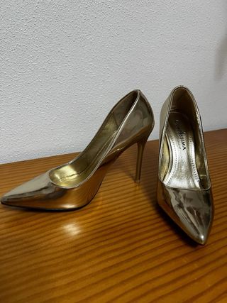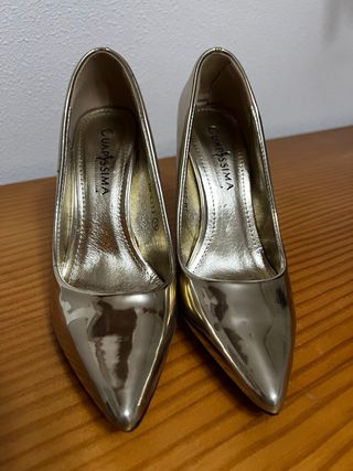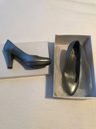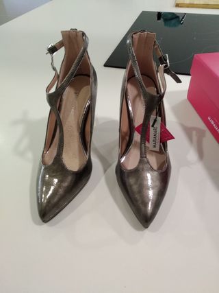 Zapatos nuevos, con su caja y repuestos de la goma del tacon, talla 36, color bronce brillo, nunca usados