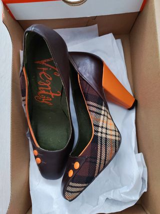 Vendo zapatos de tacón de piel y textil, de la marca española Vienty, en la talla 37, sin uso. El tacón es de 7,5 cm Costaron 65 euros como se puede comprobar en la etiqueta que aun conservan Hago envíos y entrego también en mano.