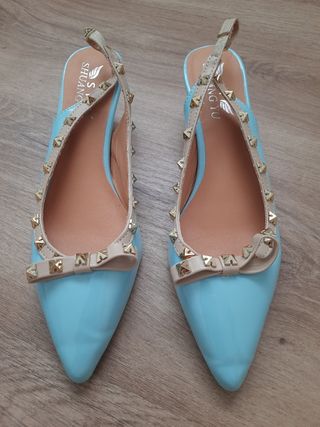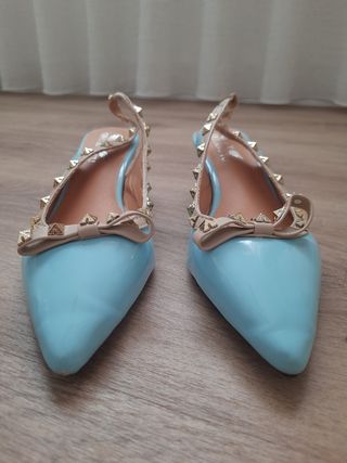 Zapatos de tacón tipo kitten en color azul bebé con brillo. Cadena con detalles dorados y lazo en la parte delantera. Acabado en punta. Elástico trasero. Altura del tacón: 5cm.