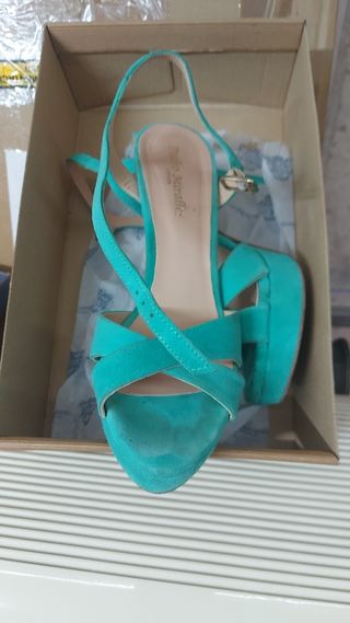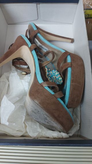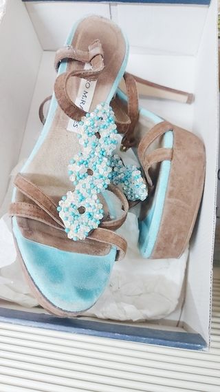 Elegantes tacones de la marca Pedro Miralles. - Diseño con tiras en color marrón. - Plataforma y detalles en color turquesa. - Adorno de pedrería en la parte delantera.