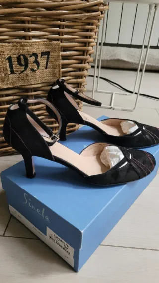 Zapatos de baile para sevillanas o flamenco. Los he llevado 2/3 veces me son pequeños, he tenido que comprar otros. Precio de compra 58 euros (tienda Alvarez, viene con ticket) - Material: Ante. - Cierre con tiras cruzadas y hebilla. - Tacón de altura media.