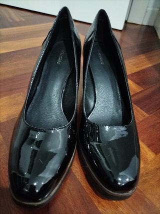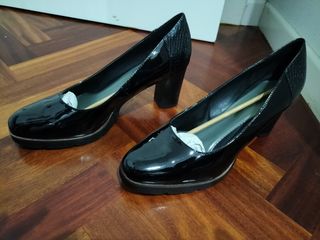 Zapatos de salón negros tipo charol, menos la parte de atrás que es mate. Solo se usaron un día, están nuevos.