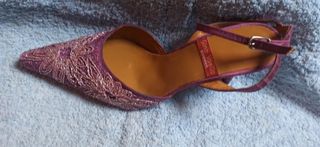 Zapato de fiesta,bordado, tacón fino y se abrocha con tira en gargantilla, muy elegante