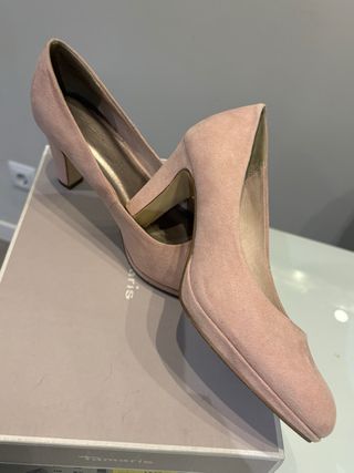 Elegantes zapatos de tacón de la marca Tamaris en color rosa palo. Puestos 1 sola vez. - Diseño de punta fina. - Tacón de altura media. - Material exterior de ante