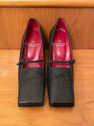 Zapatos de tacón con un diseño moderno. - Núm. 37,5 (medidas en la foto de las suelas) - Color negro/grisáceo - Textura tipo tela. - Tacón cuadrado y grueso. - Punta cuadrada. - Diseño merceditas con tira con hebilla en el empeine. - Interior en color rojo. Usados en excelente estado.