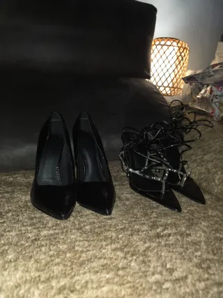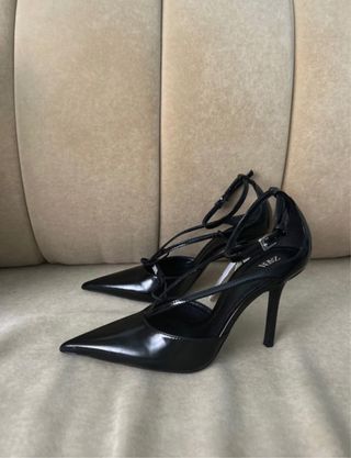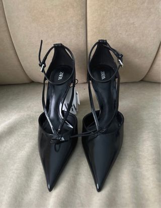 Elegantes tacones de Zara con un diseño moderno y sofisticado. - Acabado brillante. - Tiras finas cruzadas en el empeine. - Cierre con hebilla en el tobillo. - Punta afilada. - ideal para fin de año