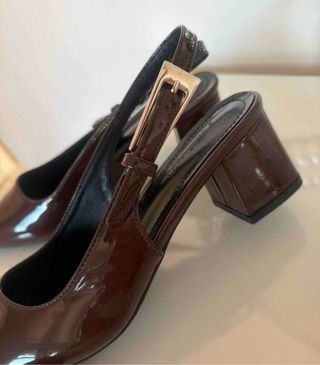 Elegantes zapatos de tacón con un diseño moderno y sofisticado. - Tacón de 5 cm de altura. - Acabado brillante. - Correa ajustable con hebilla. -Marrón chocolate