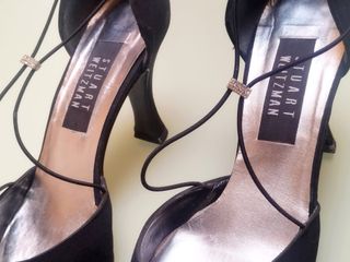 Elegantes zapatos de tacón de la marca Stuart Weitzman en raso negro. Diseño sofisticado con tiras finas y un detalle brillante en el empeine. Muy cuidado y en perfecto estado. - Material exterior de raso. - Tacón fino y estilizado. - Diseño abierto en el lateral. - Detalle de pedrería en las tiras.