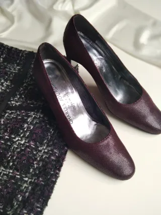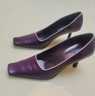 Elegantes zapatos vintage de piel de alta calidad, en un llamativo tono morado. Un toque de estilo retro para cualquier ocasión. Solo se han usado una vez. - Material: Piel - Diseño: Punta cuadrada - Tacón: Tacón de aguja