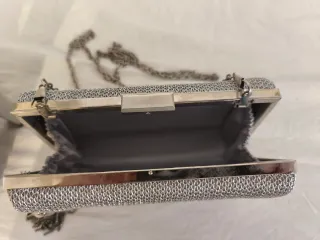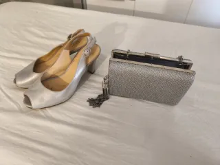 Conjunto de zapatos de piel y bolso de fiesta. - Zapatos plateados de piel con tira al talón. - Bolso de mano plateado con detalles metálicos y cadena.