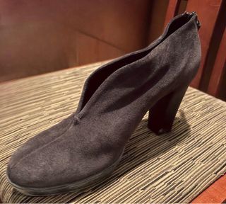 Elegante zapato abierto de invierno con tacón grueso. - Material de ante. - Cremallera trasera para facilitar el calce. - Diseño moderno con escote pronunciado.