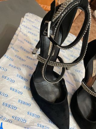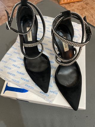 Elegantes zapatos de tacón alto con detalles brillantes. - Diseño de punta fina. - Tiras adornadas con pedrería. - Cierre de hebilla en el tobillo. Guess Originales en el interior el forro mirar la última foto