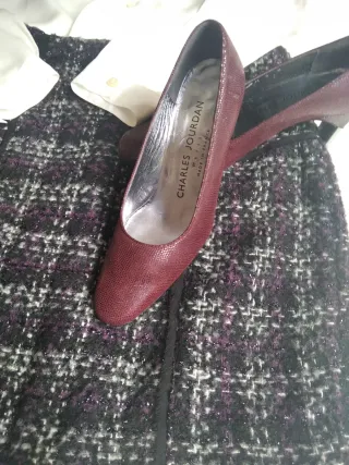 Elegantes zapatos salón de piel en tono burdeos. Marca Charles Jourdan París. Tacón muy original combinación de piel y metal. Elegantísimos.