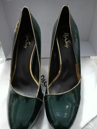 Elegantes zapatos de tacón de la marca Miss Sixty. - Color verde esmeralda brillante. - Detalles en dorado. - Diseño de salón con plataforma.