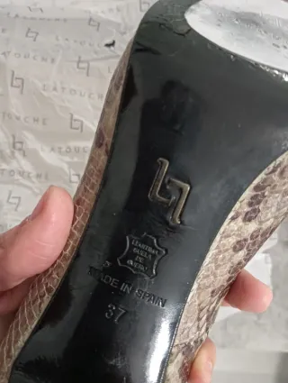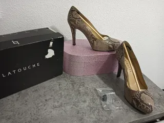 Elegantes zapatos de tacón de la marca La Touche con un llamativo estampado de serpiente. Talla 37 Bolso a juego en mi perfil - Diseño de punta. - Tacón de aguja. - Acabado brillante.