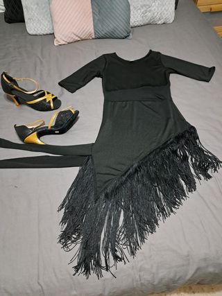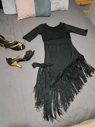 Vestido de 140 cm para niñas de cinco a siete años color negro y zapatos de salón 34. Se vende junto o por separado, zapatos 15y vestido 10,todo junto 22.