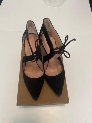 Elegantes zapatos de tacón alto con cordones. Talla 36 pero yo suelo usar un 37. Usados 1 sola vez como se puede apreciar en la suela (foto adjunta). - Diseño de tiras que se anudan al tobillo. - Plataforma delantera para mas comodidad. - Material tipo ante.